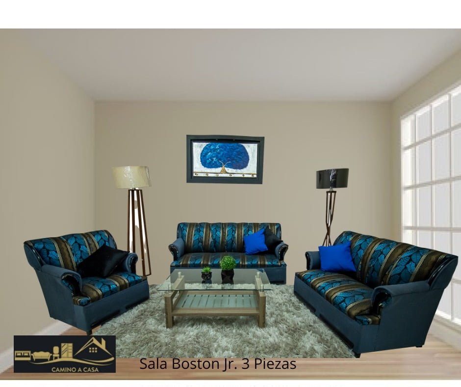 Sala 1, 2, 3; Se compone del sofá (para tres personas), loveseat (dos personas) y el sillón; las tres piezas están tapizadas en tela con un relleno de espuma reforzada, por lo que son súper cómodos.