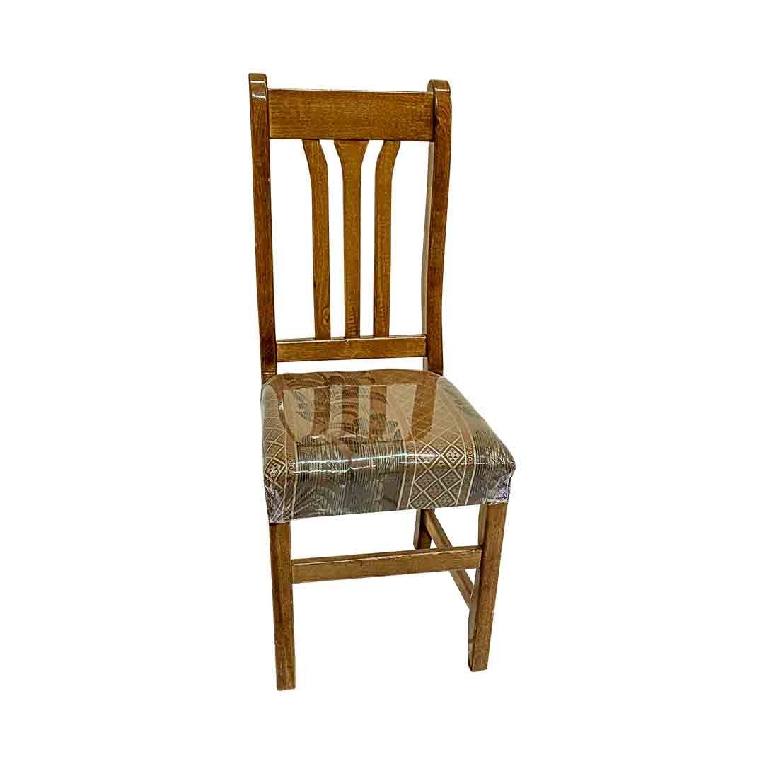 Silla de madera estilo tradicional con madera de pino reforzada, especial para comedor, con respaldo recto y decorativo curvo creando una armonía visual. Con asiento acojinado y tapizado.
